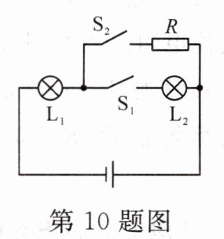 10. (2023·重庆A卷)如图所示的电路,电源电压恒为6 V,白炽灯泡L₁标有“5 V 0.25 A”字样,白炽灯泡L₂标有“6 V 3 W”字样,R的阻值为10 Ω。忽略温度对灯丝电阻的影响,只闭合开关S₁时,灯泡