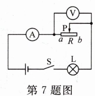 7. 如图所示。小灯泡规格为“12 V 6 W”(灯泡电阻不变),闭合开关,当滑动变阻器的滑片 P 移至 a 端时,电流表示数为 0.25 A;当滑片 P 至 b 端时,电压表示数为 3 V,则 (