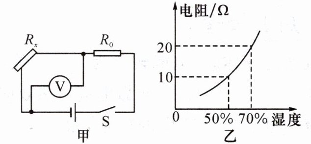 8. 研究石墨烯的特性时,将石墨烯制成浸电阻 $ R_x $ 附着在叶片上,从外部检测植物含水量的变化。已知电源电压恒为 $ 3\ V $,定值电阻 $ R_0 $ 的阻值为 $ 5\ \Omega $,$ R_x $ 的阻值随植物含水量的变化如图乙,闭合开关 $ S $,当湿度由 $ 50\% $ 升高到 $ 70\% $ 时,电压表的示数