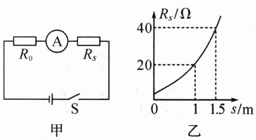 9. 图甲所示为汽车倒车雷达中的距离报警器简化电路图。电源电压为 $ 12\ V $,$ R_0 $ 为定值电阻,$ R_s $ 为传感器的核心部件,其阻值随传感器到障碍物距离变化的关系如图乙所示。当传感器到障碍物的距离为 $ 1.5\ m $ 时,报警器开始报警,此时电路中的报警电流为 $ 0.2\ A $。