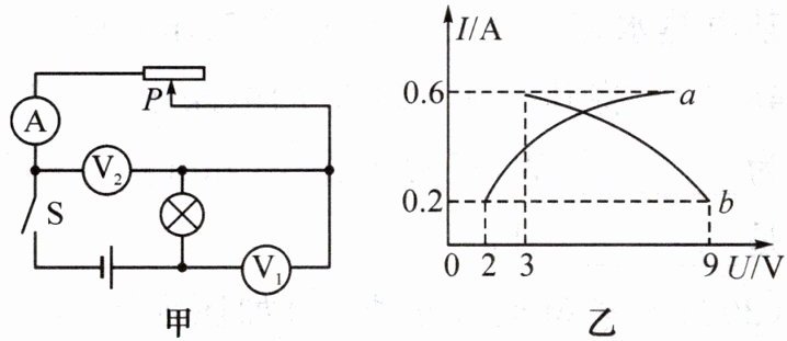 7. (2024·铜陵铜官区期末)如图甲所示,电源电压恒定,闭合开关 $ S $ 后,将滑动变阻器的滑片从最右端移至灯泡正常发光的位置,此过程中电流表示数与两个电压表示数的关系图像如图乙所示。下列说法正确的是(