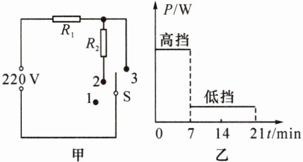 (1)由图甲知,开关S接1触点时,电路开路,为“关”;接2触点时两电阻串联,为“低挡”;接3触点时只有$R_1$接入电路,为“高挡”。由$P=\frac{U^2}{R}$可得$R_1$的阻值: