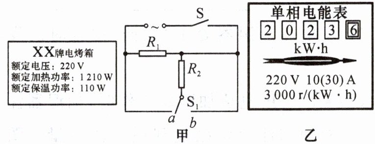 (3) 傍晚用电高峰期,小科想测量电烤箱在工作时的实际功率,于是他断开了家中其他用电器,仅让电烤箱在加热状态下工作,$ 1 \min $ 内如图乙所示的电能表转盘转了 $ 50 r $,求电烤箱实际的加热功率。