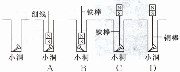 7. 在一次课外实验活动中,一颗铁质的小螺丝掉入细小狭长的小洞中。小科设计了以下四种方案,其中不能取出小螺丝的是(