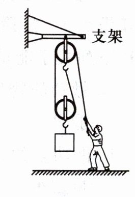 15. 如图所示,滑轮组悬挂在水平支架上,重为 $ 600 \, N $ 的工人站在水平地面上,竖直向下拉动绳子自由端,使重为 $ 300 \, N $ 的物体以 $ 0.2 \, m/s $ 的速度匀速上升。在这个过程中,人施加的拉力 $ F $ 为 $ 200 \, N $,两个滑轮质量相等,不计滑轮组的绳重和摩擦。求:
