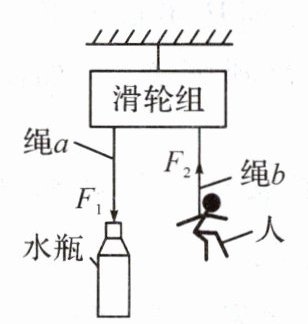 4. (2023·广州)用滑轮组进行“一瓶水提升一个人”活动,如图,水瓶匀速直线下降 $ 10 \, m $,使人匀速升高 $ 0.5 \, m $,水瓶对绳 $ a $ 的拉力为 $ F_{1} = 30 \, N $,绳 $ b $ 对人的拉力为 $ F_{2} = 480 \, N $。此过程(