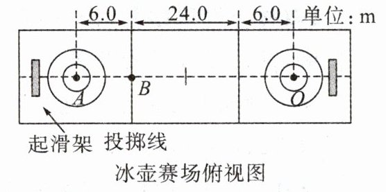 5. (2024·乐山改编)如图所示,某次比赛中,运动员推着冰壶从$A$点运动$6m$到达$B$点时轻轻松手,随后冰壶沿冰道运动$30m$停在$O$点。若运动员对冰壶的水平推力为$9N$,冰壶运动中受到水平方向的阻力,大小恒定为$1.5N$。从$A$点到$O$点冰壶沿直线运动,求此过程中: