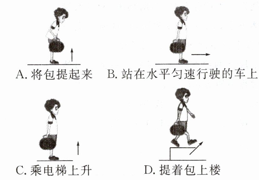 2. 如图所示,是小新提书包回家的情景,小新提书包的力不做功的是哪幅图(