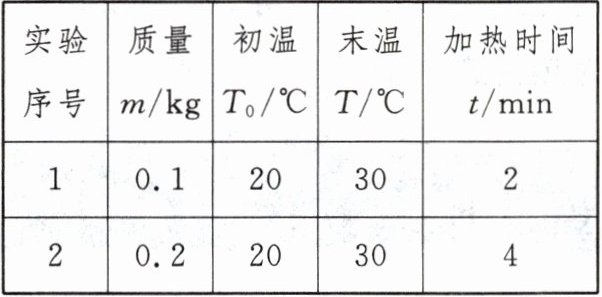3. 在探究“水吸收的热量与水的质量和水升高的温度是否有关”的实验中,记录的实验数据如下表。