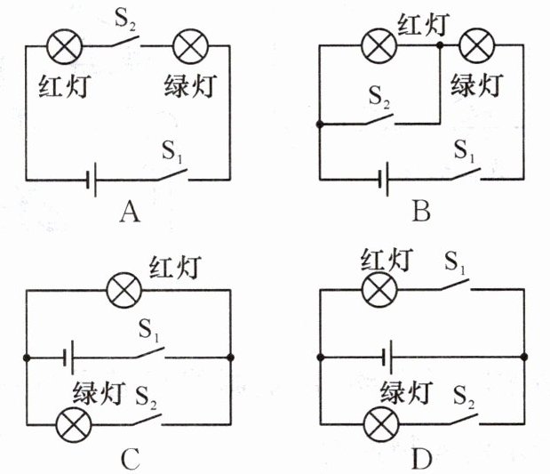 13. (2024·通辽)某交通路口指示车辆通行的信号灯由红灯和绿灯组成,红灯停,绿灯行,以下是红、绿灯工作时的电路简图。你认为正确的是(