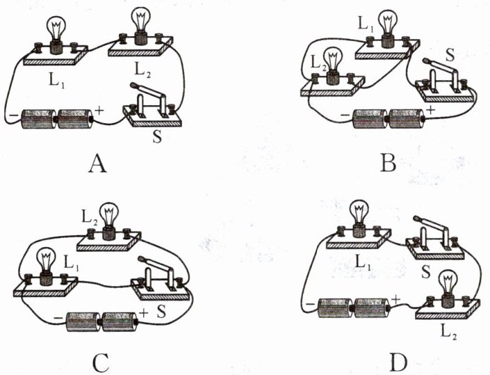 9. 如图所示的电路中,开关能够同时控制两盏灯,且两灯发光情况互不影响的电路是(