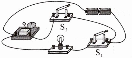 15. 小明发现,在下面的电路中,只要更改一根导线的连接,就可实现只闭合$S_{2}$时,灯泡和电铃均不工作,但只闭合$S_{1}$,灯泡可发光,若要灯泡和电铃同时工作,则需要将两个开关同时闭合。请在图中将需要更改的导线用“×”标出,并画出更改之后的导线。