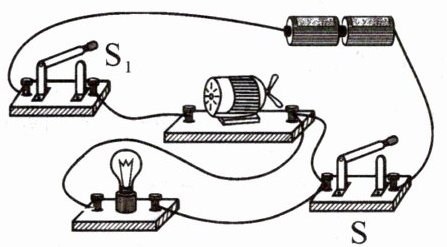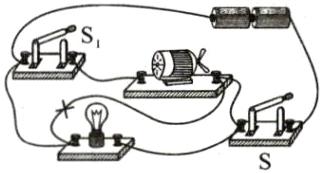 12. 在下面的电路中,有一根导线连接错误,请在错误的导线上画“×”,并画出正确的连接方式。要求:改正后,灯泡和电动机并联,开关$S$控制所有用电器,$S_{1}$只控制电动机。