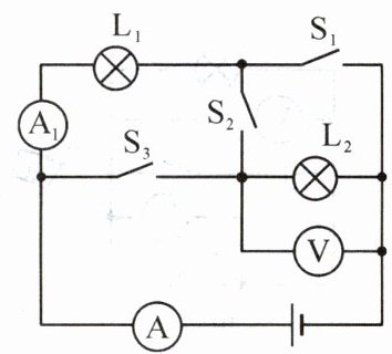 (3) 当 $ S_{1} $、$ S_{3} $ 闭合,$ S_{2} $ 断开时,电流表 $ A $ 和 $ A_{1} $ 的示数分别为 $ 0.5 \, A $ 和 $ 0.2 \, A $,则通过 $ L_{1} $、$ L_{2} $ 的电流分别为多少? 此时电压表示数为多少?