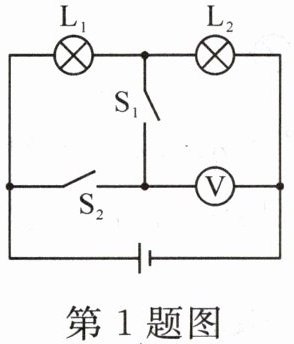1. 如图所示的电路中,电源电压保持不变,当只闭合开关 $ S_{2} $ 时,电压表示数为 $ 6 \, V $,当只闭合开关 $ S_{1} $ 时,电压表的示数为 $ 2 \, V $,则 $ L_{1} $ 两端的电压为