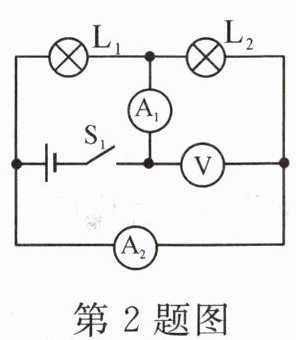 2. 如图所示的电路中,闭合开关,灯泡 $ L_{1} $ 和 $ L_{2} $ 的连接方式是