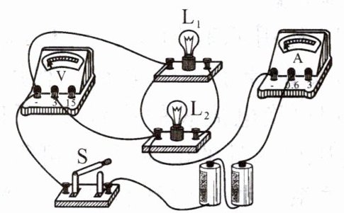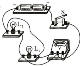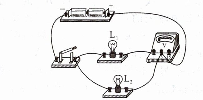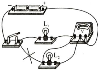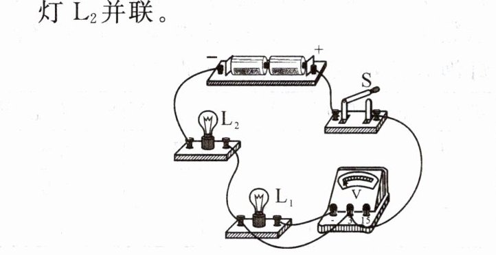 14. 实物电路如图所示,在原图上只改动一根导线,使电路成为串联电路,并使电压表测量灯 $ L_{2} $ 两端的电压。(在改动的导线上画“$ × $”,并画出重新连接的导线)