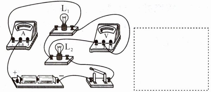 13. 在实验室,小明连好了一个如图所示的电路,请你在虚线框中画出这个电路图,并标明 $ L_{1} $ 和 $ L_{2} $。