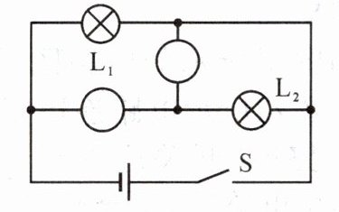 9. 在如图所示的圆圈内,分别填入“$ V $”或“$ A $”,使得开关 $ S $ 闭合后,两灯泡并联且都能发光。