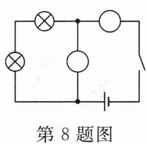 8. 在如图所示电路图中的两个“$ ◯ $”中填入电压表或电流表的符号,使开关闭合后两个小灯泡串联。