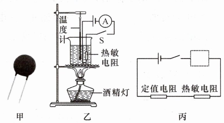 (填“均匀受热”或“迅速升温”)。(4) 实验结束后,大家一起动手用这个热敏电阻和一个电表制作了一个指针式温度计,设计的电路如图丙所示。图丙中虚线框内的电表应为