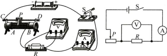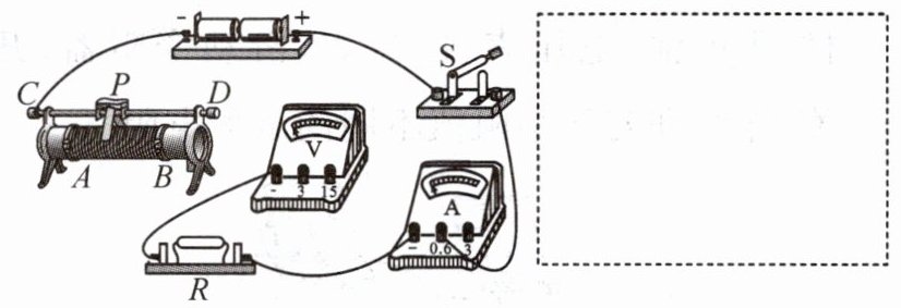 10. 如图,实物图有两根导线尚未连接,请用笔画线代替导线将实物图补充完整,并在虚线框中画出正确的电路图。要求:(1)电压表测定值电阻R两端的电压;(2)闭合开关,当滑动变阻器的滑片向右移动时,电流表的示数变大。