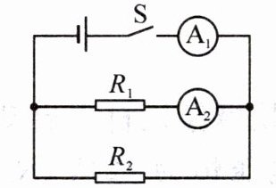 11. (2024·重庆B卷)将阻值为10Ω的电阻$R_1$与另一电阻$R_2$接入电路,如图所示。闭合开关$S$,电流表$A_1$的示数为0.45A,电流表$A_2$的示数为0.3A。求: