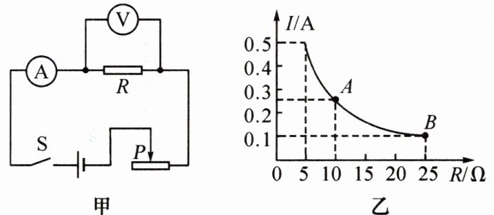 9. 在“探究电流与电阻的关系”实验中,电路如图甲所示,图乙是根据实验数据画出的$I-R$图像。由图像可知,电压表示数始终保持
