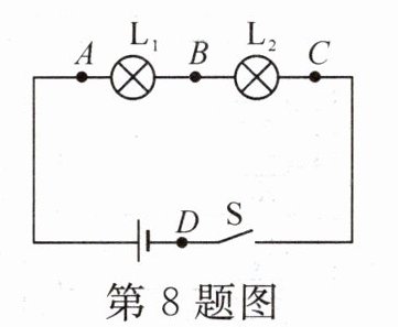 8. 如图所示,小明在探究串联电路电流规律实验中,闭合开关后,两灯均不亮,他用一个电流表检测电路故障。当电流表接 $ A $、$ B $ 两点时两灯均不亮;当电流表接 $ B $、$ C $ 两点时,有一盏灯亮了,产生这一现象的原因可能是 ()、