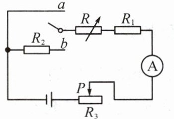 (1)闭合开关$S$,将滑动变阻器的滑片$P$移动到$b$点,记录此时电流表示数为$I_{1}$。