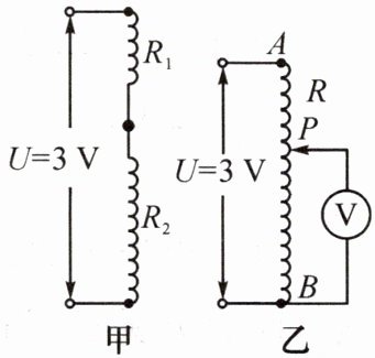 (2)如图乙所示,将$R_{1}$、$R_{2}$串联起来构成一根电阻丝(不考虑长度的变化),移动滑片 P,求电压表示数变化范围。