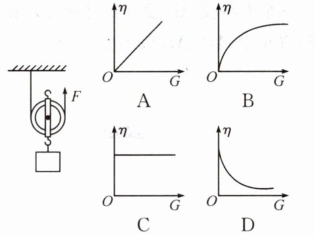 8. 如图所示,用手沿竖直方向匀速拉一个动滑轮,使挂在下面重为$G$的物体缓慢上升,动滑轮的重力不可忽略,现改变物体的重力$G$,不计绳重与摩擦,则动滑轮的机械效率$\eta$与物体重力$G$的关系可能符合下列图中的(