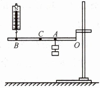 ①用轻绳悬挂杠杆一端的$O$点作为支点,在$A$点用轻绳悬挂总重为$G$的钩码,在$B$点用轻绳连接一个弹簧测力计,使杠杆保持水平。