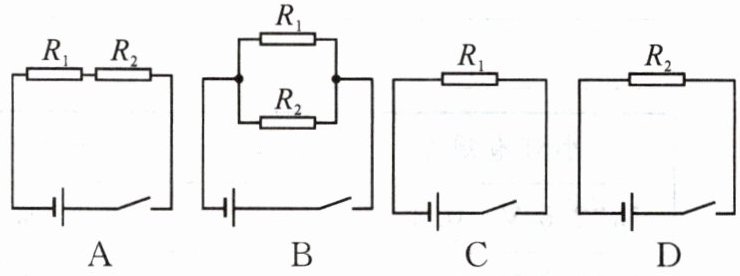 6. 有两个定值电阻$R_{1}$、$R_{2}$,且$R_{1}>R_{2}$,按下列四种方式连接在电路中,电源电压相同,闭合开关后,电路总功率最大的是(