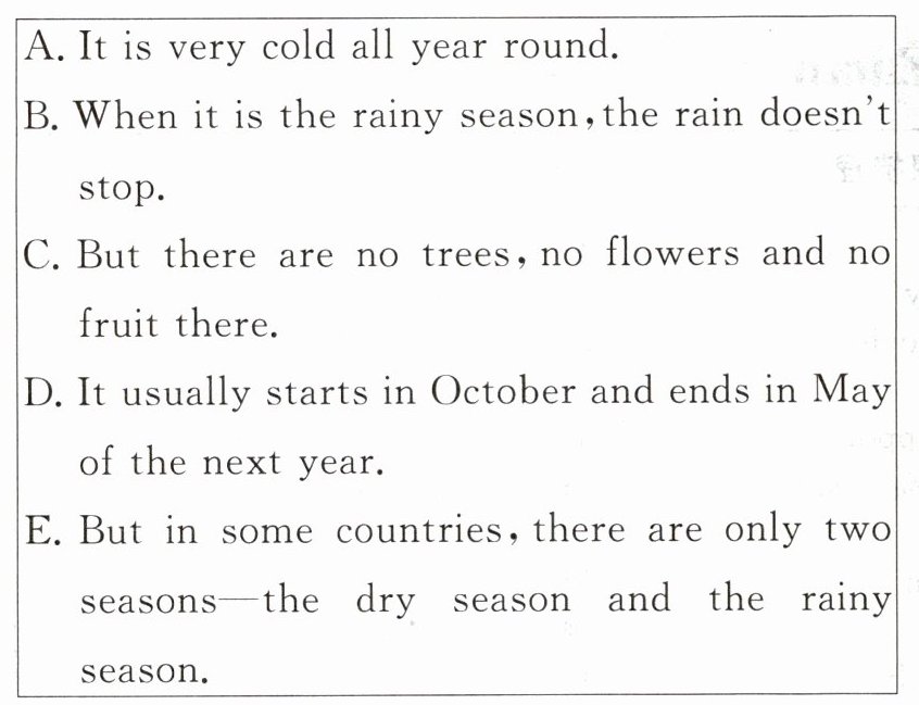 There are four seasons in a year—spring, summer, autumn and winter. ______ They are India (印度) and some countries in Africa. It is never cold there and it doesn't snow.