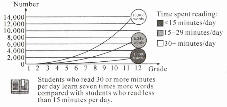 Students who read 30 or more minutes per day learn seven times more words compared with students who read less than 15 minutes per day.
