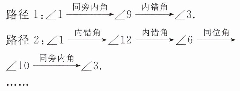 15. 如图,这是一个跳棋棋盘,其游戏规则是:一个棋子从某一个起始角开始,经过若干步跳动后,到达终点角. 跳动时,每一步只能跳到它的同位角、内错角或同旁内角的位置上. 如从起始位置 $ \angle 1 $ 跳到终点位置 $ \angle 3 $ 的路径有: