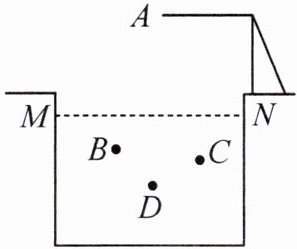 15. (教材P34习题T5变式)如图,$MN$为一个泳池内的水平面.某跳水运动员(看作一个点)从点$A$处起跳,$B$,$C$,$D$为他三次跳水后落入水中的位置,已知点$B$和点$D$的高度差是$1.5m$,点$C$与点$A$的高度差为$10.5m$.以水面为基准,在水面上方记为正,下方记为负,点$A$表示的是$+7.5m$,点$B$表示的是$-2m$,则点$B$比点$C$高多少?点$D$比点$A$低多少?