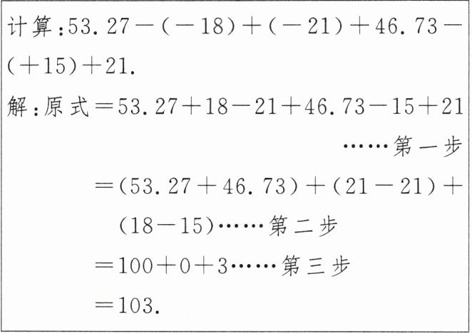 $\begin{aligned}&计算:53.27 - ( - 18) + ( - 21) + 46.73 - (+15) + 21.\\&解:原式 = 53.27 + 18 - 21 + 46.73 - 15 + 21 \cdots \cdots 第一步\\&= (53.27 + 46.73) + (21 - 21) + (18 - 15) \cdots \cdots 第二步\\&= 100 + 0 + 3 \cdots \cdots 第三步\\&= 103.\end{aligned}$