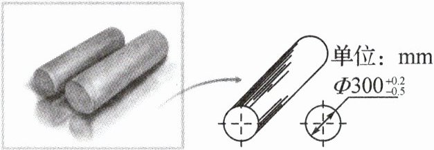 【知识背景】如图,在机械零件图纸上通常用$\varPhi 300_{-0.5}^{+0.2}$来表示轴的尺寸加工要求,这里300表示直径是300 mm,$-0.5$和$+0.2$是指直径在$(300 - 0.5)mm$到$(300 + 0.2)mm$之间的产品都属于合格产品.