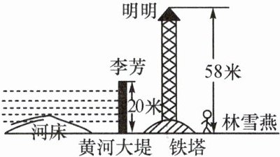 9. 新考向 真实情境 如图,黄河大堤高出开封市20米,另有开封铁塔高约58米.李芳和好朋友林雪燕、明明出去玩,李芳站在黄河大堤上,林雪燕站在地面上放风筝,顽皮的明明则爬上铁塔顶.按下列要求分别用正数、0、负数表示出三人的位置(“高于”记为“+”,“低于”记为“-”).