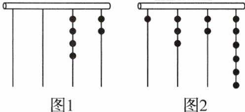 13. 新考向 传统文化 我们常用的数都是十进制数,如$2639 = 2×10^{3}+6×10^{2}+3×10^{1}+9$.我国古代《易经》一书中记载,远古时期,人们通过在绳子上打结来记录数量,即“结绳计数”.一位母亲在从右到左依次排列的绳子上打结,采取满七进一的方式,用来记录孩子自出生后的天数.例如图1表示的是孩子出生后$30$天时打绳结的情况$(4×7^{1}+2 = 30)$,那么图2表示的是孩子出生后