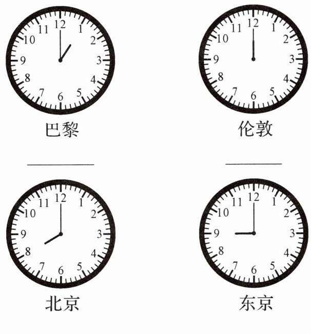 10. 如图,在横线上分别填写四个城市相应钟表上时针与分钟所成角的度数。