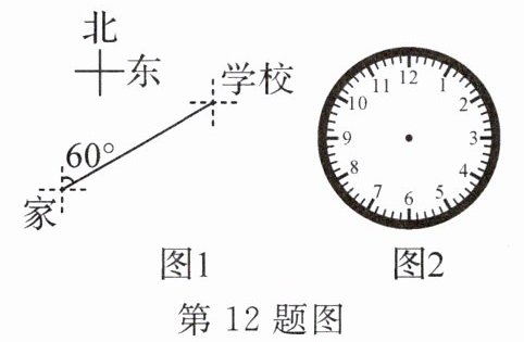 12. 如图1,小萍从地图上测得学校在她家的北偏东$60^{\circ}$方向,她看到家里的钟表表盘如图2所示.若把家的位置看成钟表表盘的中心,则她可以说学校在家的(