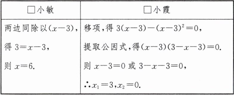 小敏:$×$;小霞:$×$. 正确的解答:移项,得$3(x - 3)-(x - 3)^2 = 0$,提取公因式,得$(x - 3)(3 - x + 3)=0$. 则$x - 3 = 0$或$3 - x + 3 = 0$,$\therefore x_1=3,x_2=6$.