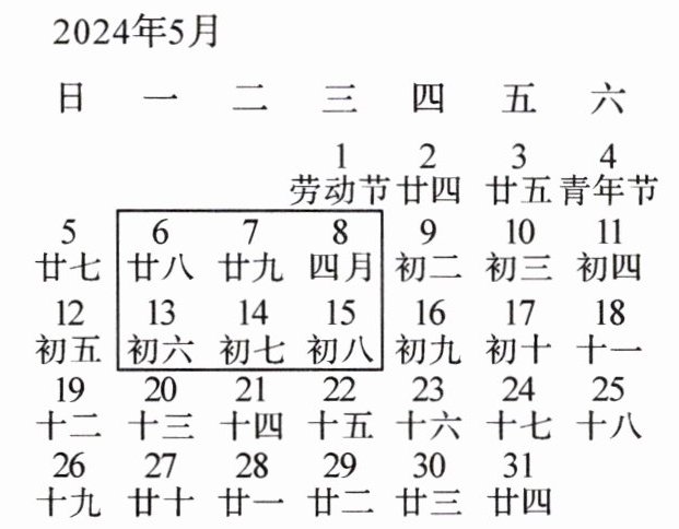 4. 下图是2024年5月的月历表,用一个方框在表中圈出六个数(如图所示),若圈出的六个数中,最小的数与最大的数的乘积为136,求这个最小的数(请用方程知识解答).