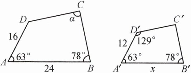 解:由题意,得$\frac{16}{12}=\frac{24}{x}$,$\therefore x = 18.\because \angle C' = 360^{\circ} - (63^{\circ} + 129^{\circ} + 78^{\circ}) = 90^{\circ}$,四边形$ABCD$与四边形$A'B'C'D'$相似,$\therefore \angle C = \angle C' = 90^{\circ}$,即$\alpha = 90^{\circ}$。