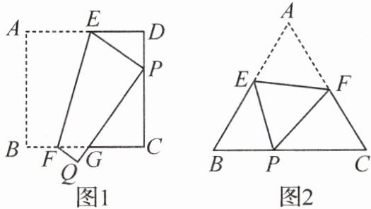 (2)如图2,将边长为$5$的等边三角形纸片$ABC$折叠,使顶点$A$落在边$BC$上的点$P$处(点$P$与点$B$,$C$不重合),折痕为$EF$,当点$P$在边$BC$的什么位置时,$\triangle BEP$与$\triangle CPF$的面积比是$9:25$?请写出求解过程。