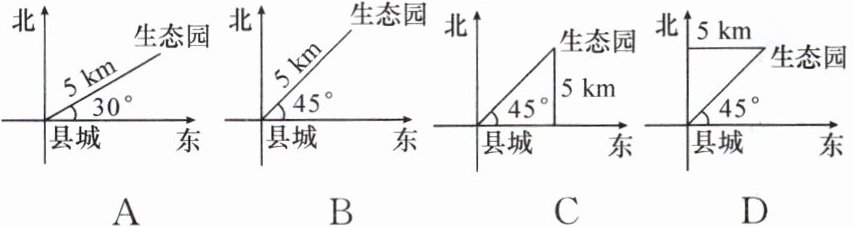2. 生态园位于县城东北方向5km处,下列选项中,表示正确的是(