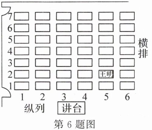 6. (2023·南阳宛城区期中)如图所示的是某教室学生座位平面示意图,老师把王明的座位“第5列第2排”记为$(5,2)$.若小东的座位为$(3,4)$,则以下四个座位中,与小东相邻且能比较方便地讨论交流的同学的座位是(